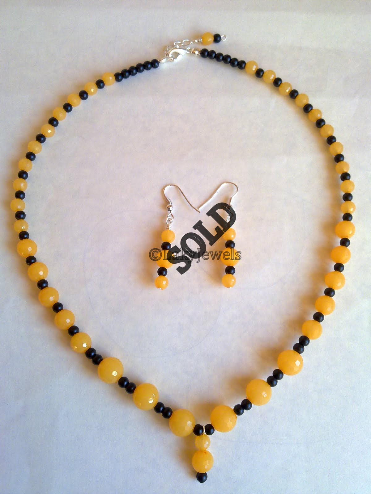Necklace setsYellow Jade And Black Glass Pearl Necklace Setby gpavaniupdated on 17th January 201828th October 2010Leave a Comment on Yellow Jade And Black Glass Pearl Necklace Set This set is made with yellow jade beads and black glass pearl beads. Total Necklace Length is 17 inchs Total Earrings Length is 11/2 inchs SOLD